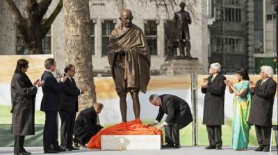 Acompañado del ministro indio de Finanzas, Arun Jaitley, y del nieto del político indio, el exgobernador de Bengala Occidental Shri Gopalkrishna Gandhi, Cameron afirmó que la estatua es un «vibrante homenaje a una de las figuras más importantes de la historia mundial».